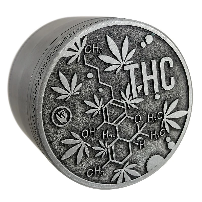 4-dielna kovový drvička so sitom a zásobníkom na peľ. Obsahuje magnetický patent. Motív: molekula THC. Priemer 5cm