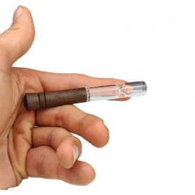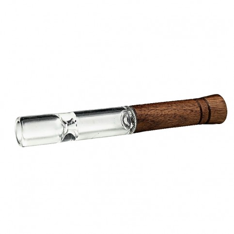 Sklenená fajka - šlukovka z hrubého skla s dreveným náustkom, pre komfortné fajčenie bez rizika popálenia. Praktická spoločníčka akurát do tvojho vrecka!